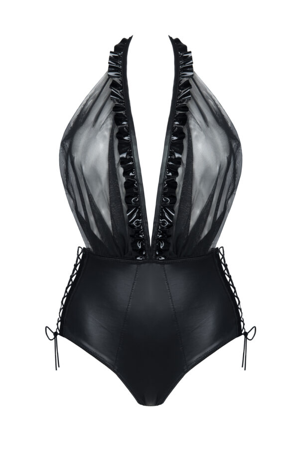 Black body, made of shiny PVC material, transparent tulle material and stretchy, matt wetlook material. The side laces are made in nickel-free metal eyelets. The product […]